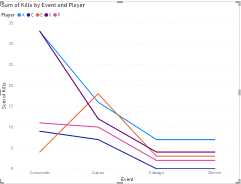Next I tried a line chart. This I think is the best for my analysis. I can see the events across the bottom and the colors for the players make it easy for me to compare them with each other. I am not color blind, so this works for me.