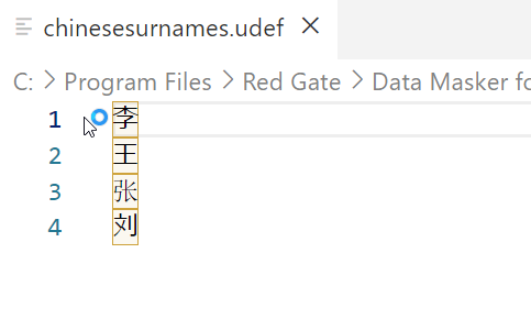 The masking sets are in Program Files below the Redgate folder. This is an administative folder, so you need to have admin rights to make a new file. I did that and opened my file in VSCode, which defaults to UTF-8 format. Since I want to use Chinese characters, I need to use a text file that supports unicode.