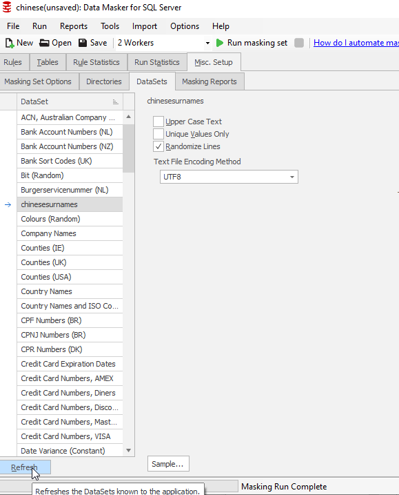 I opened SQL Data Masker and created a new masking set. I connected this to my database and then went to the Misc. Setup tab. I didn’t see my set (I had this open), so I clicked “Refresh” at the lower left. This brought the data set into the list view. As you can see, I should have capitalized the file name.