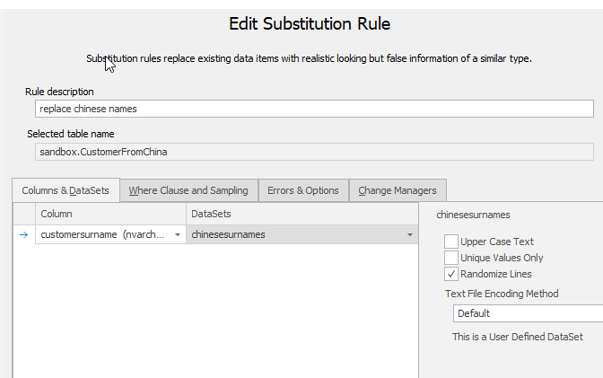 Next, I added a new Substitution rule. I picked the CustomerFromChina table and the ChineseSurname column. I also selected my custom data set. This is noted on the right of the image below.