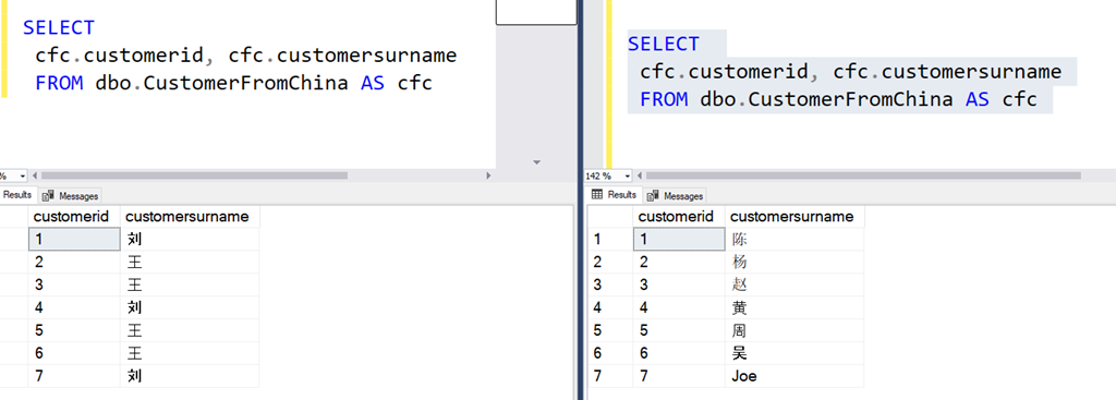 CREATE TABLE dbo.CustomerFromChina ( customerid INT NOT NULL CONSTRAINT CustomerFromChinaPK PRIMARY KEY , customersurname nvarchar(100) ) GO INSERT dbo.CustomerFromChina (customerid, customersurname) VALUES (1, N'陈'), (2, N'杨'), (3, N'赵'), (4, N'黄'), (5, N'周'), (6, N'吴'), (7, N'Joe') GO