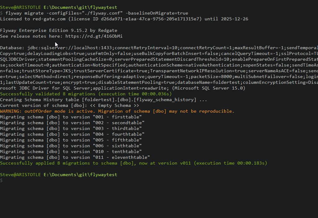Flyway is controlled by a number of options. These can be in a configuration file or they can be passed into the command line. I’m lazy, and I like things self-contained, so I tend to drop things into the flyway.conf file and specify this in the command line.