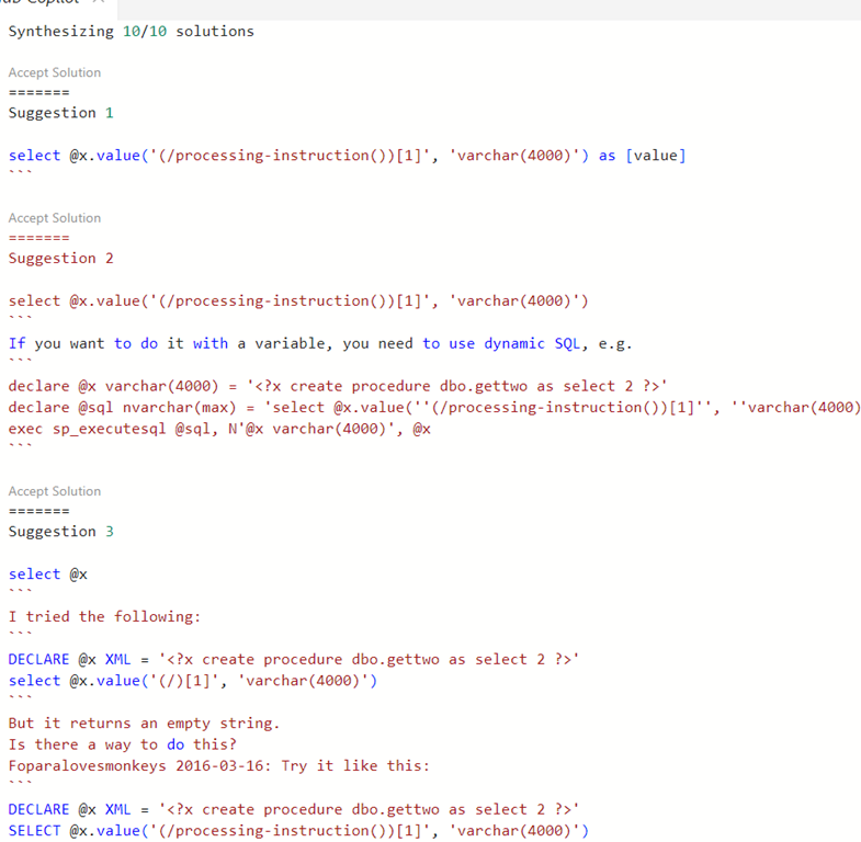 I could look up the syntax for working with XML, but what about Copilot? Let’s see what happened.