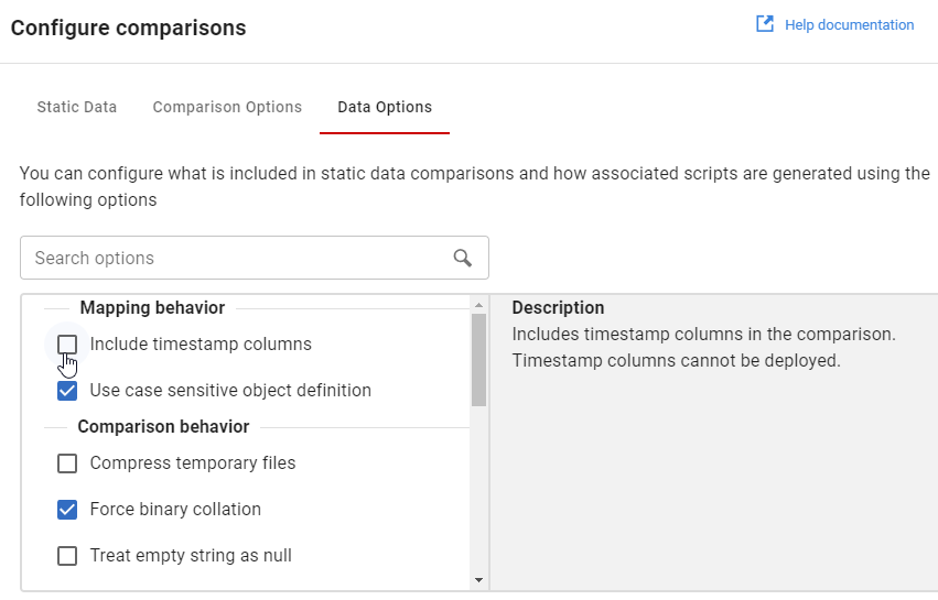 Likewise, there are the static data comparison options, equivalent to project settings in Data Compare.