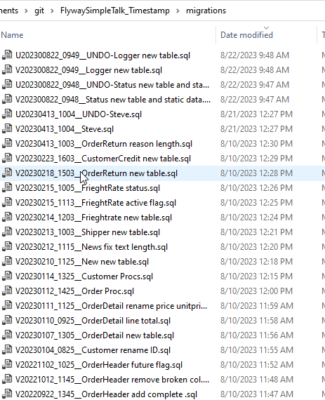 We might see a lot of migration scripts over time in a folder. Certainly I can see this in the file system for one of my projects.