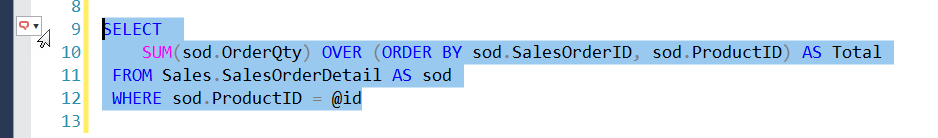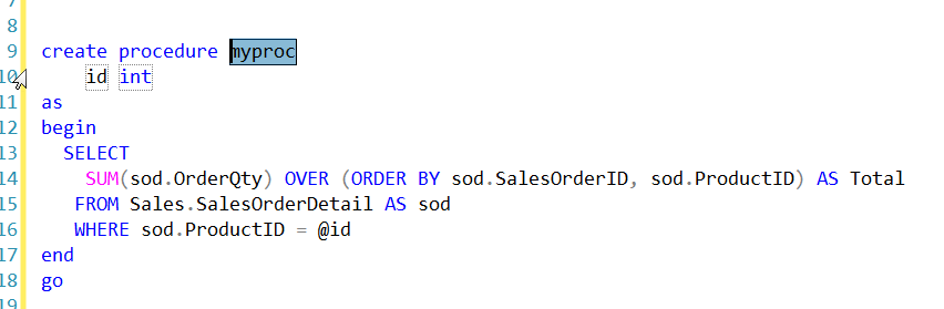 CREATE PROCEDURE dbo.GetGroupedSales @Id INT AS BEGIN SELECT SUM(sod.OrderQty) OVER(ORDER BY sod.SalesOrderID, sod.ProductID) AS Total FROM Sales.SalesOrderDetail AS sod WHERE sod.ProductID = @id END