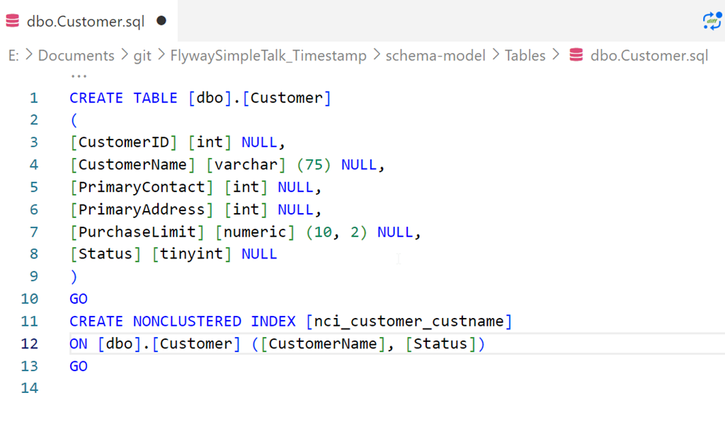CREATE TABLE [dbo].[Customer] ( [CustomerID] [int] NULL, [CustomerName] [varchar] (75) NULL, [PrimaryContact] [int] NULL, [PrimaryAddress] [int] NULL, [PurchaseLimit] [numeric] (10, 2) NULL, [Status] [tinyint] NULL ) GO CREATE NONCLUSTERED INDEX [nci_customer_custname] ON [dbo].[Customer] ([CustomerName], [Status]) GO
