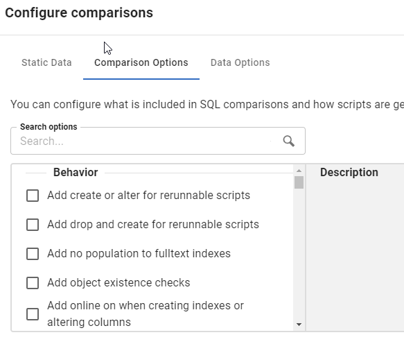 Once I click that, I get a new dialog. This starts with static data, but I’ll click the second tab, which is Configure comparisons. This shows all the options available in the Compare engine