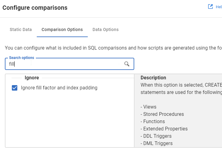 Rather than scroll, I’ll type in the search box, and I see fill gets me the “Ignore fill factor and index padding” option.