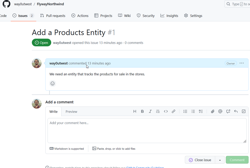 Many people use GitHub and adding issues is easy. You go to the Issues tab, click “New” and enter details. What is required might vary by project. I have a public demo project here: https://github.com/way0utwest/FlywayNorthwind