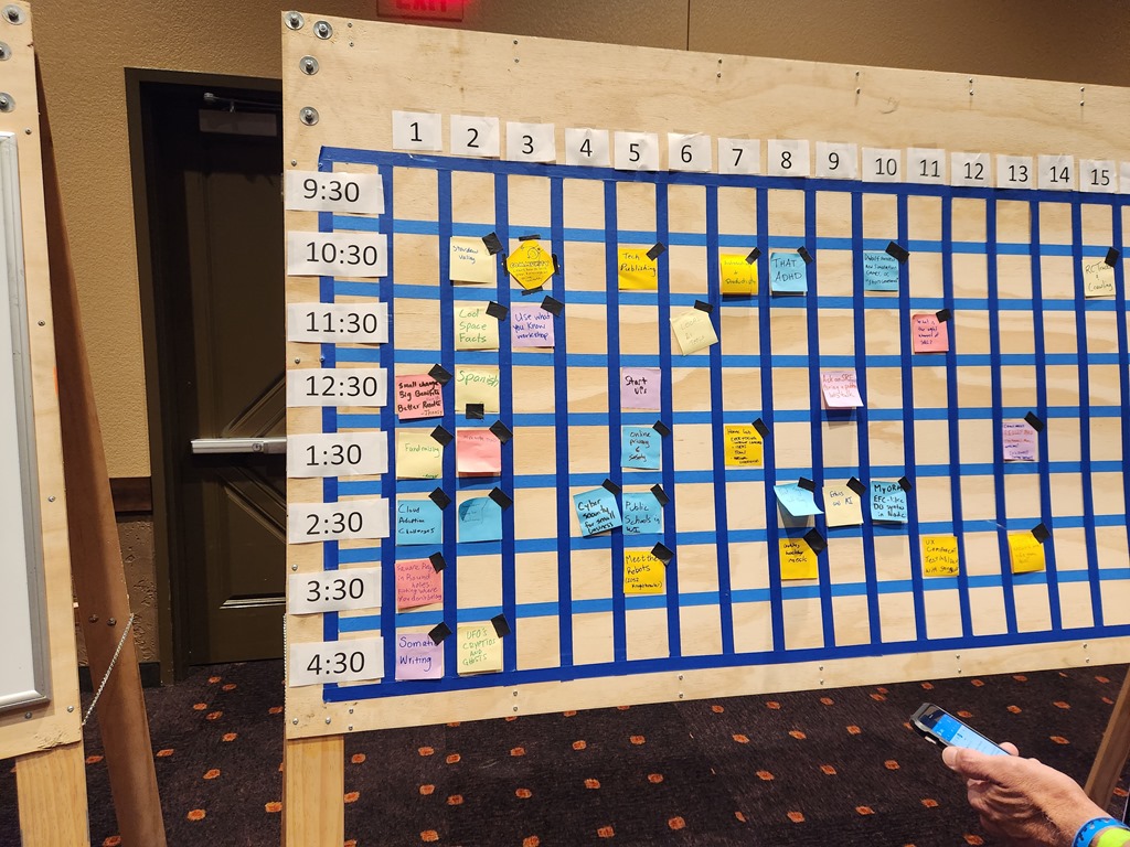 Some people will fill out a topic and post it during lunch the first day, reserving a place and time later. Anyone can do this anytime and some speakers do this after their sessions, dropping a note in a space and then going to a table or location and continuing the discussion on their topic.