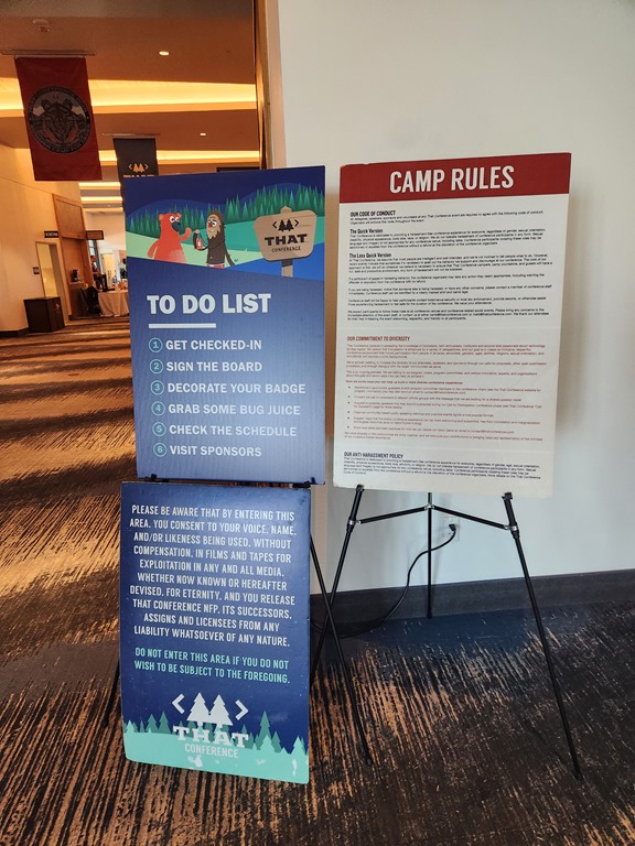The conferences from THAT, apart from having fun with the name, are camping themed. Really summer camp themed, as in a US kids summer camp. The organizers decorate a lot of things camp-related, including the rules and a to-do list as you walk in.