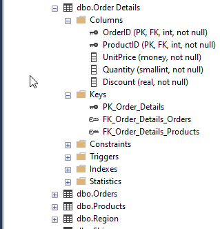 I’ve got a copy of the Northwind sample database on my system, named Westwind so I can experiment. As you can see below, the Order Details table has a few FKs in it, one to Orders and one to Products.
