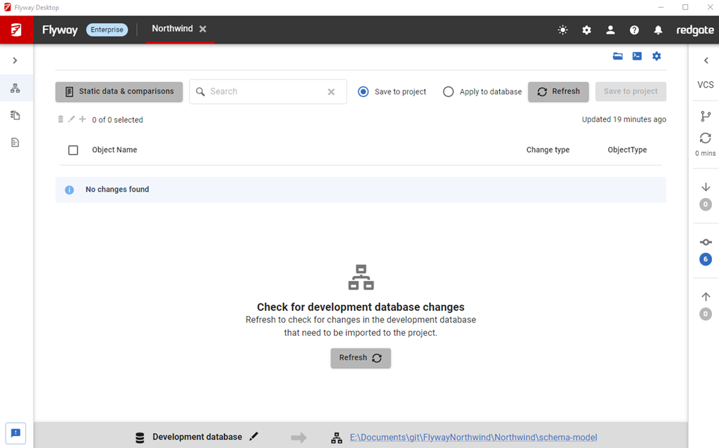 When working with a Flyway Desktop project, you see a screen like this. Most of the time, this works great, and as I showed in another tip, the VCS Git client is on the right side in a blade.