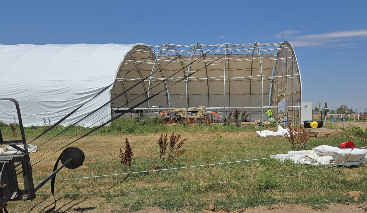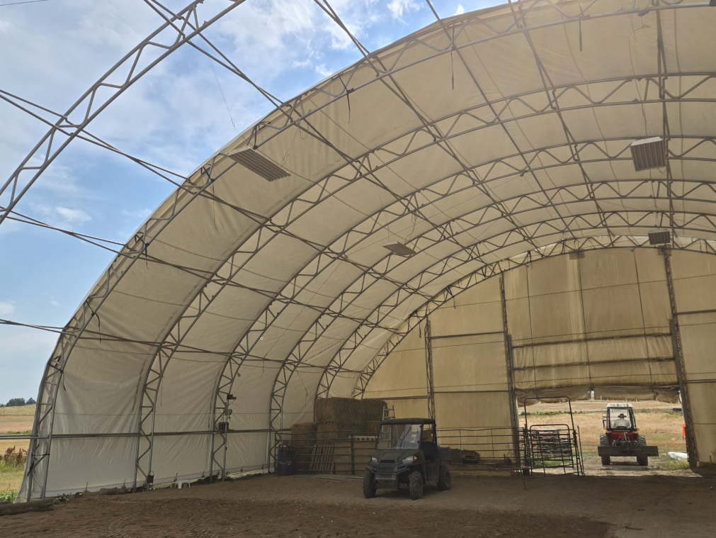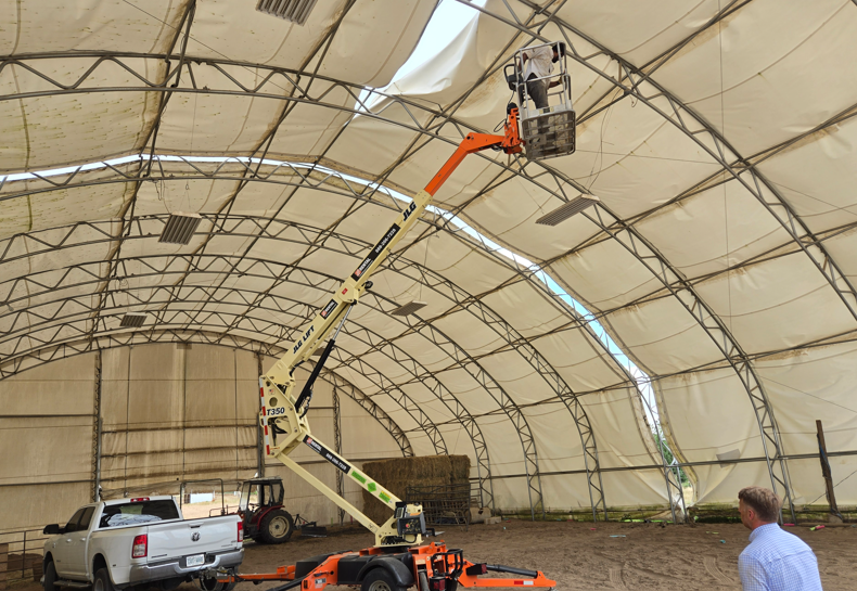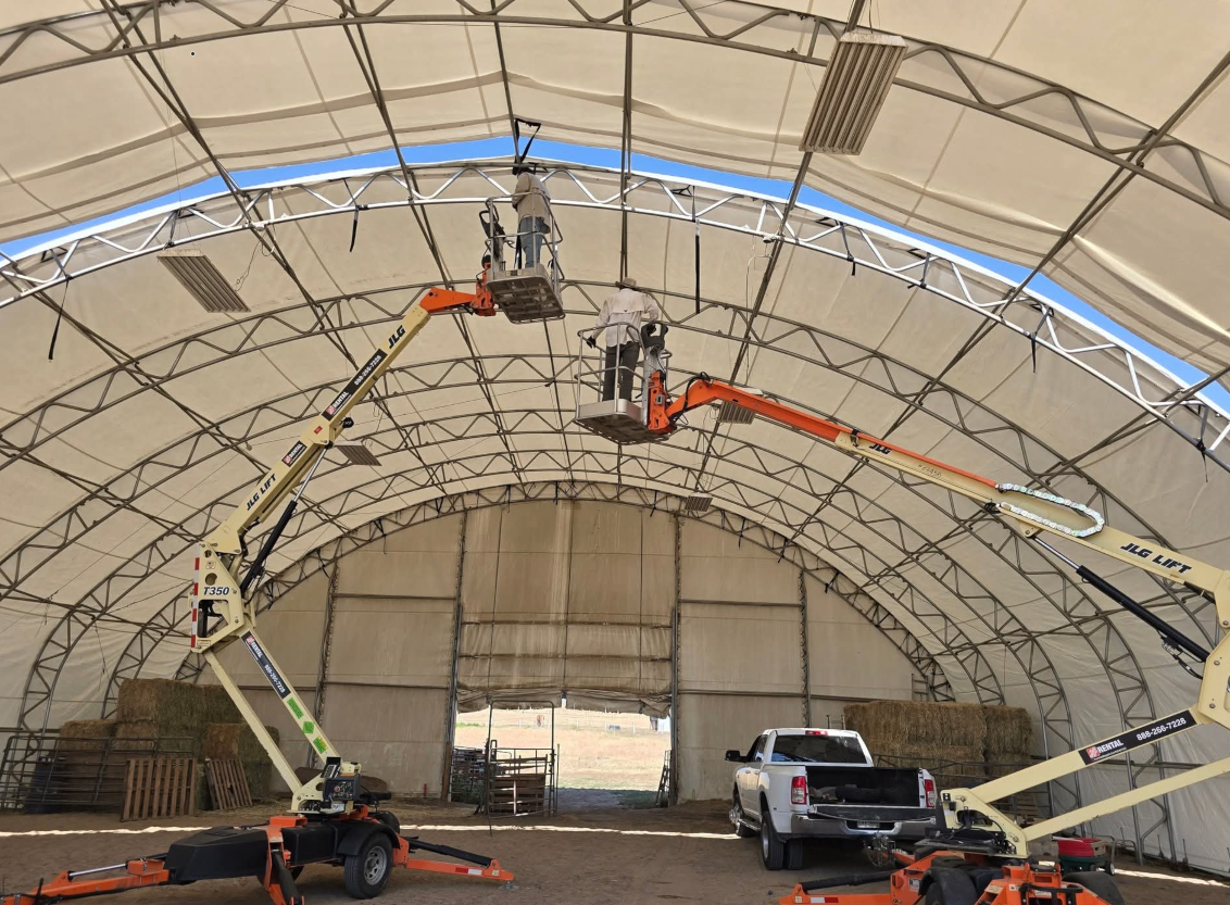 It’s been on the ranch since 2010, but a very heavy hailstorm damaged it almost two years ago. A number of small holes in the fabric let rain in, which has worsened over time. We worked through an insurance claim to get new fabric and some installation compensation, but decided to do some of the work ourselves since the install cost was high. We did pay for a vendor consultant to help for a week, but my wife, kids, and did all the work.