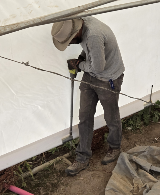 Day 2 was pulling over the first piece of fabric. We used the tractor to do this during a time of low wind. We can pull up to about 10mph, but after that it’s too dangerous.