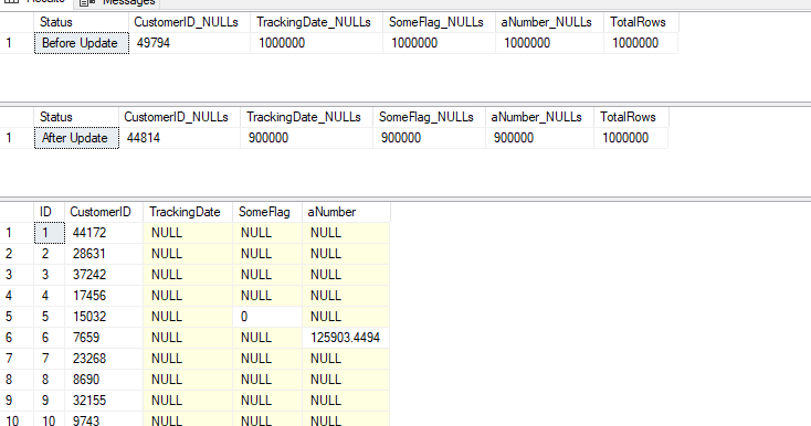 Let’s re-run the update script and aim not for 10% updates, but 65% updates. This gets me to only 315k NULL values in the tables, or a little over 70% of my sparse columns are full of data. My sizes now are: