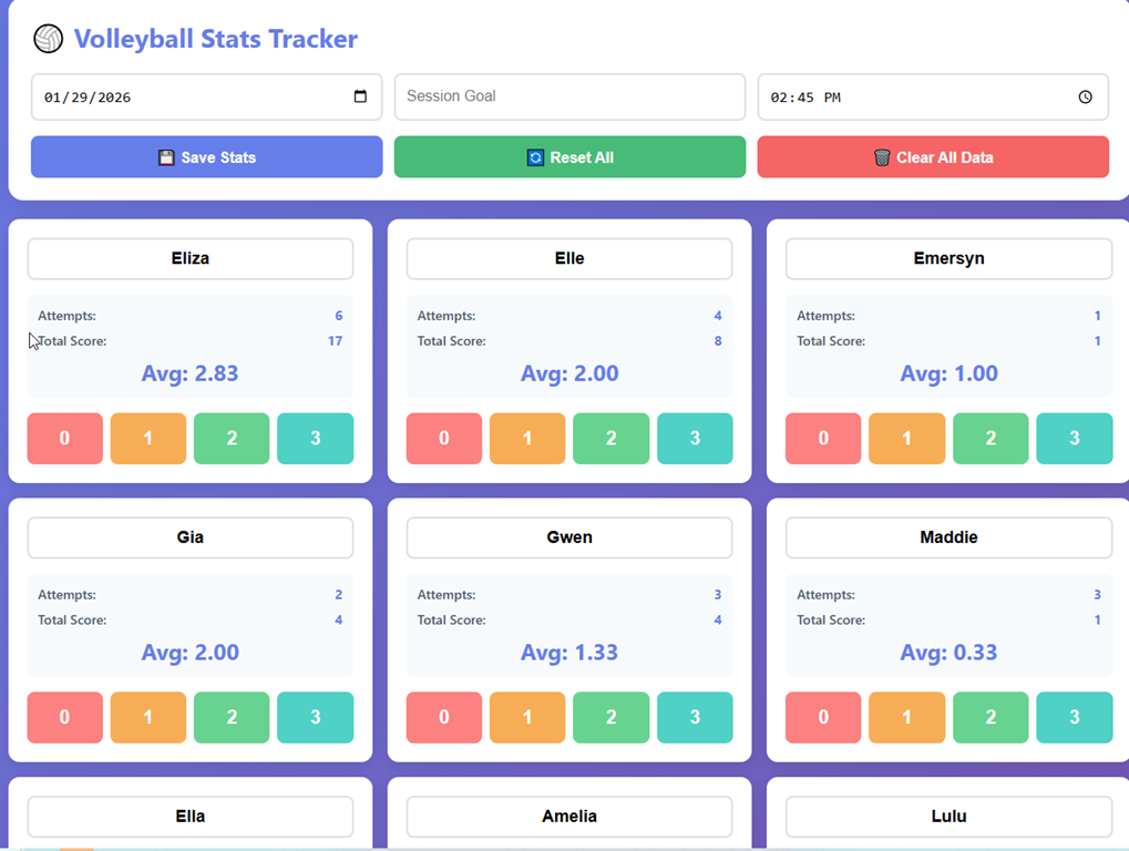 volleyball stats. Display a list of players in a 4×3 grid, like the image. Each player’s name is customizable. A date, goal, and time can be entered. For each player, display 4 buttons: 0,1,2,3 which are used to rate a pass. There should be a real time calculation of the average pass score for a player (sum of items/ attempts). Save this to a text file with the datetime data entry was completed.