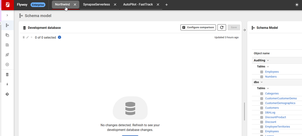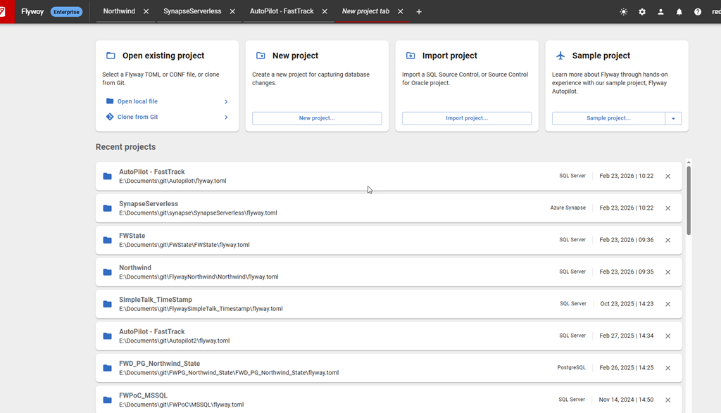 This gives me a list of my projects, the same way I’d see them when I started Flyway Desktop. Notice the 3 I have open are listed first, as they were most recently touched.