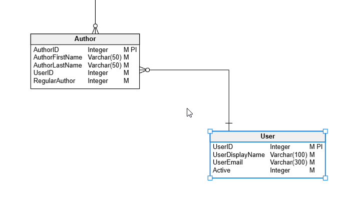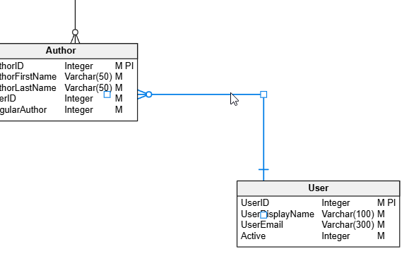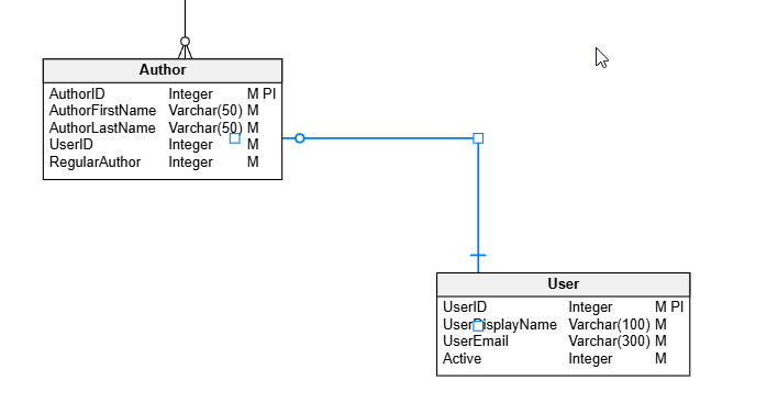 In a previous post, I looked at adding a FK. Let’s do things a little differently here. Let’s change a constraint to better reflect the relationships between entities. In this case, let’s look at a part of my model. I have the User and Author entities linked as shown below. Note that we have a User with a 1:many relationship to Author.